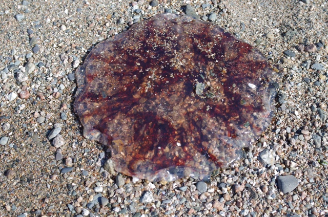 The water was super clear, super cold, and the seaweed had no insects nor smell, to our surprise. Perhaps the water temperature? There were a few jellyfish. This was about ten inches in diameter.