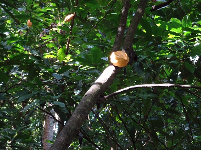 Cocoa pods, which grow from the trunk and are yellow when ripe. The “World’s Best Chocolate” starts here, the sign says.