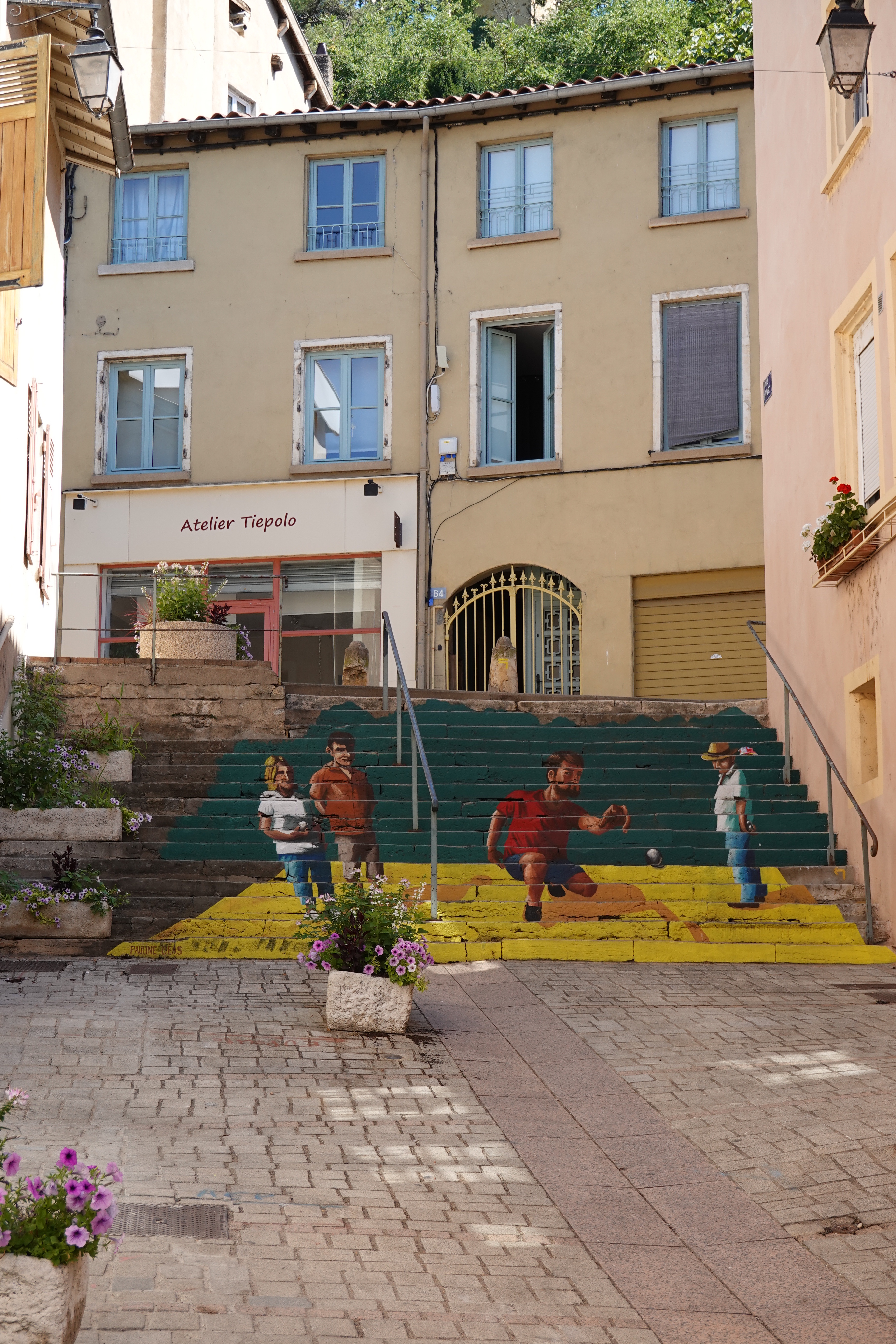Walking along the Saone River in TrévouxTrévoux on the Saone RiverThe church in TrévouxFinding a geocache along the river walkStairs painted to depict a lawn bowling game